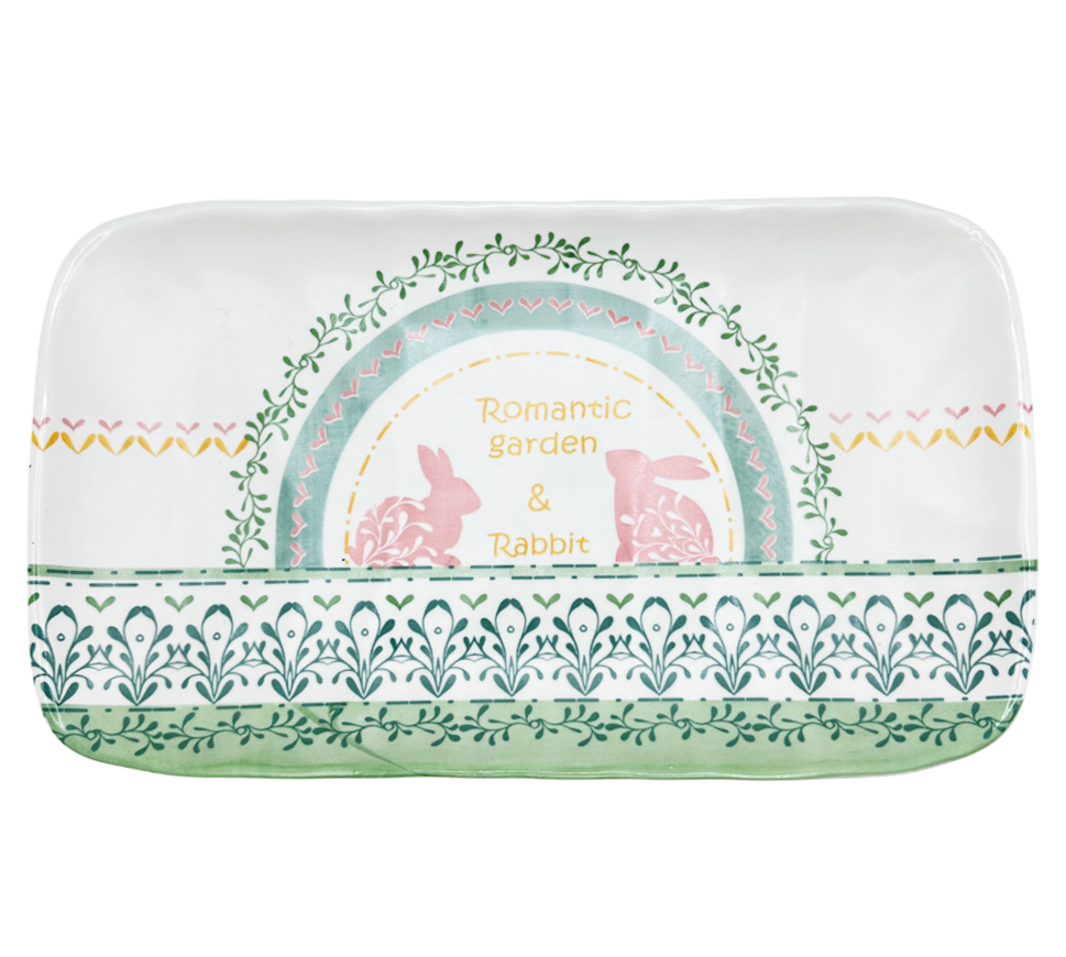 Adaugă un plus de farmec mesei de Paște cu acest platou ceramic „Lucky Rabbit”, având dimensiunea de 30x18 cm. Decorat cu motive florale delicate și doi iepurași simpatici, acest platou este perfect pentru servirea gustărilor, dulciurilor sau preparatelor festive.