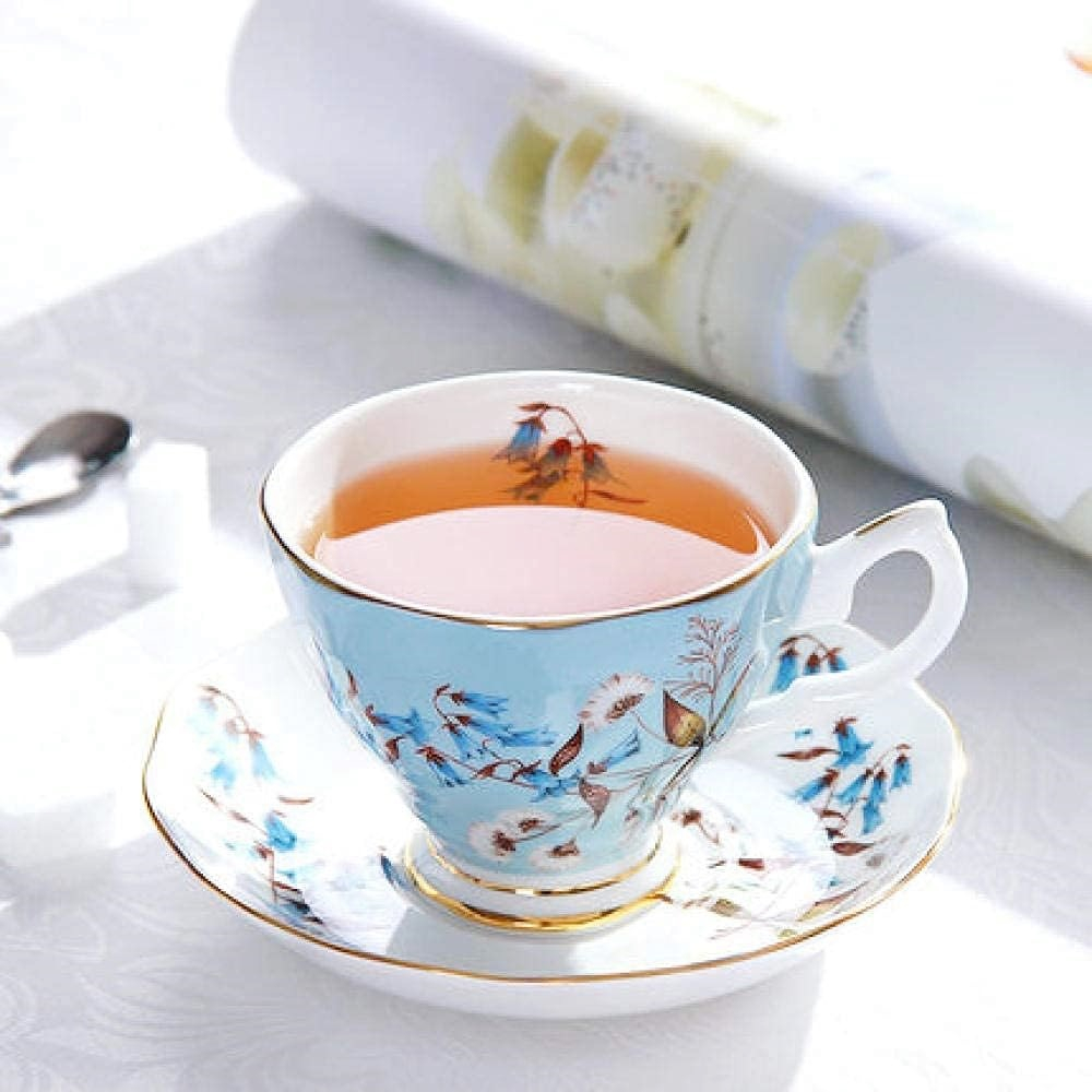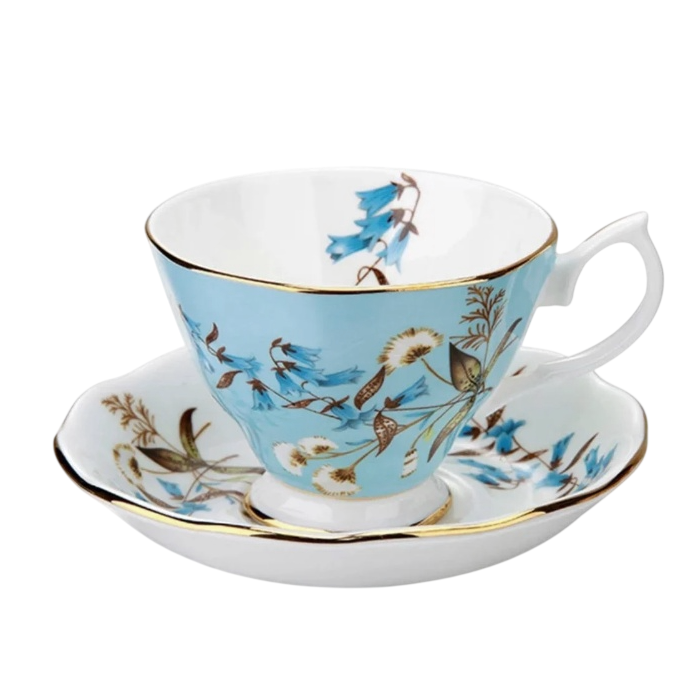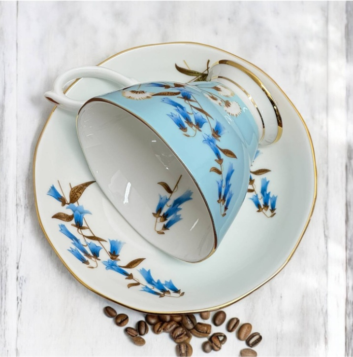 Un set delicat și luminos, perfect pentru momentele tale de răsfăț. Această ceașcă din porțelan cu farfurioară asortată impresionează prin nuanța elegantă de albastru pastel și decorul floral fin, completat de accente aurii subtile pe margini.