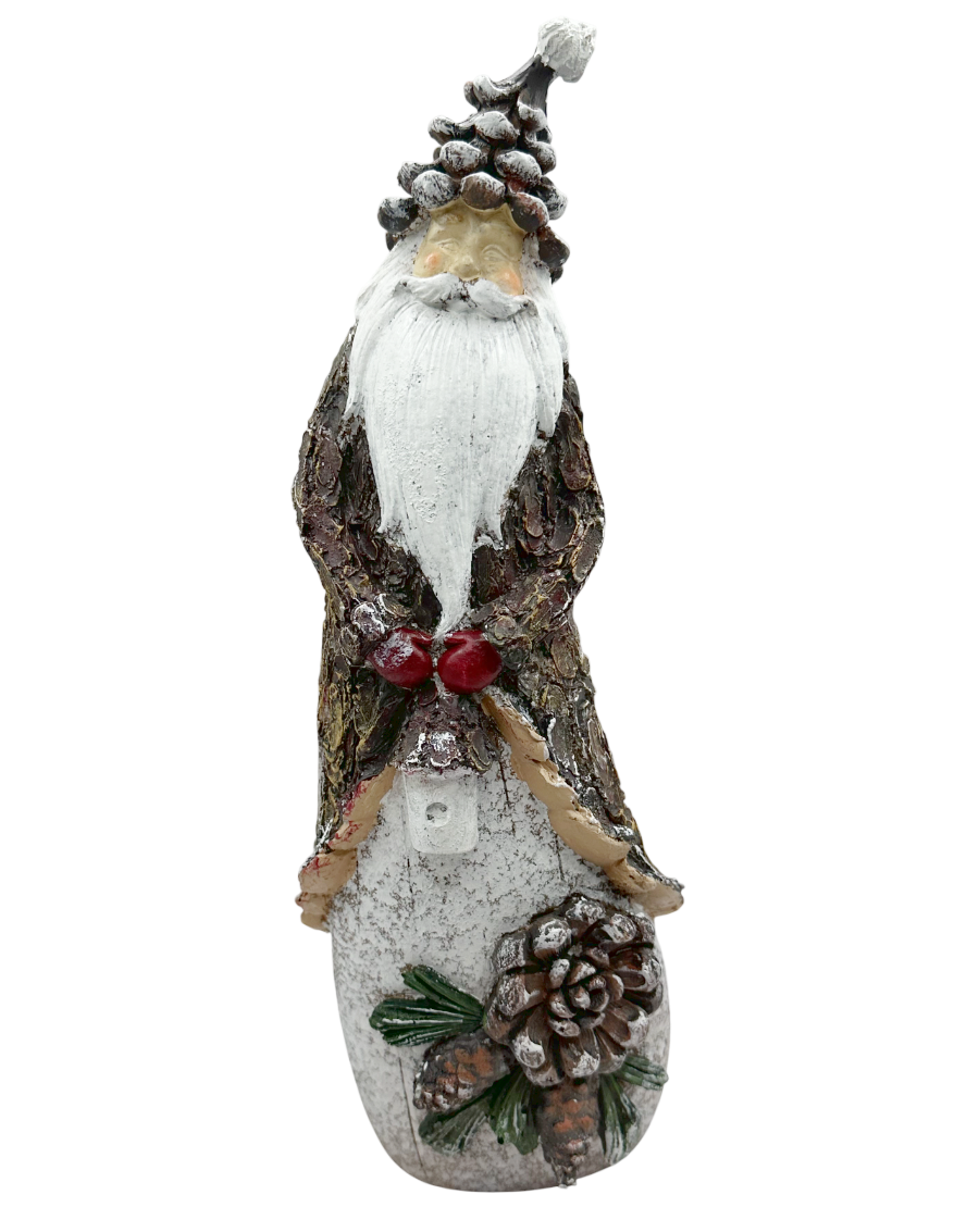 Figurină decorativă Moș Crăciun în stil rustic, cu haină texturată din „scoarță” și detalii de conuri și fructe de pădure.