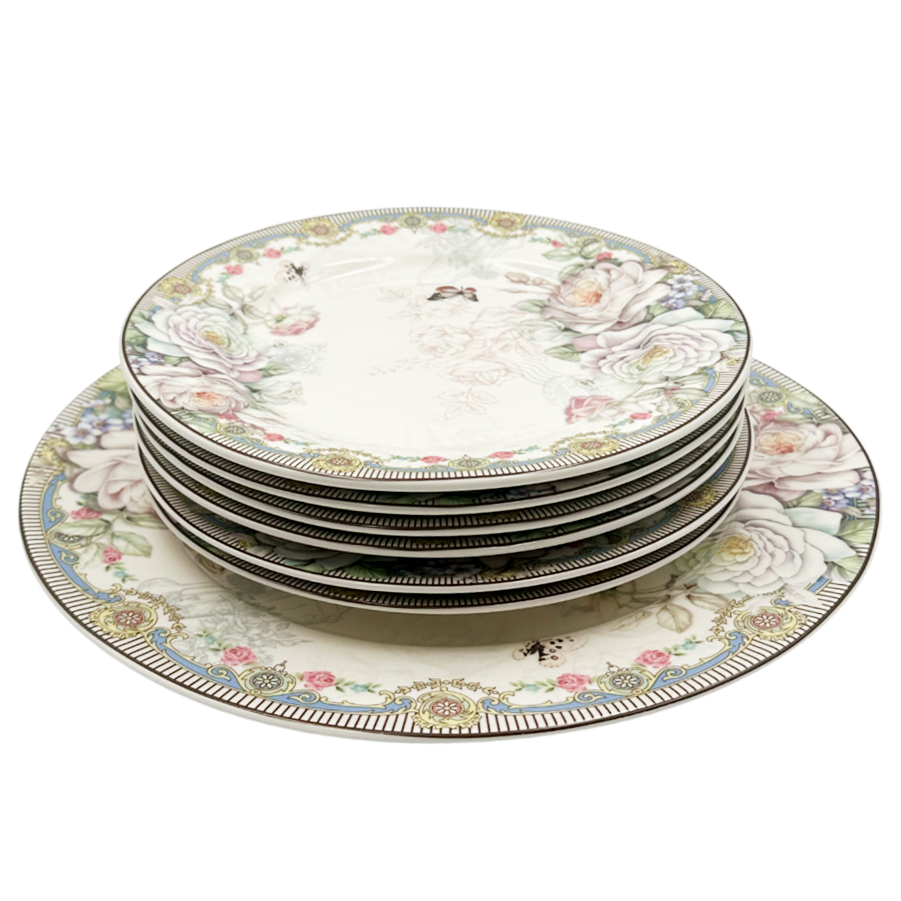 Set rafinat de farfurii cu design floral vintage, ideal pentru deserturi, aperitive sau servirea elegantă a mesei. Include 6 farfurii și 1 platou mare, realizate cu imprimeu delicat și detalii fine.